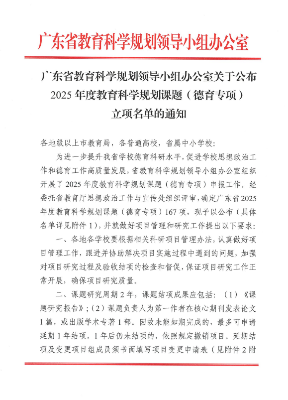 2026近日,广东省教育厅与广东省教育科学规划领导小组办公室相继公布了2025年度相关课题立项名单,广东省教育科学规划(德育)专项立项167项,广东省高校思想政治教育课题立项258项。我校此次申报获批3项课题立项,其中,广东省教育科学规划课题(德育专项)2项、广东省高校思想政治教育课题1项。学生处陈梅副教授主持申报的德育专项课题“同伴排斥对大学生不确定心理压力的影响机制与干预研究”(项目编号:2025JKDY074)聚焦于同...