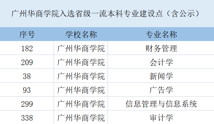 目前,新伟德国际1946(原广东财经大学华商学院)会计学、新闻学、财务管理、广告学、信息管理与信息系统、审计学共6个专业入选省级一流本科专业建设点(含公示)。