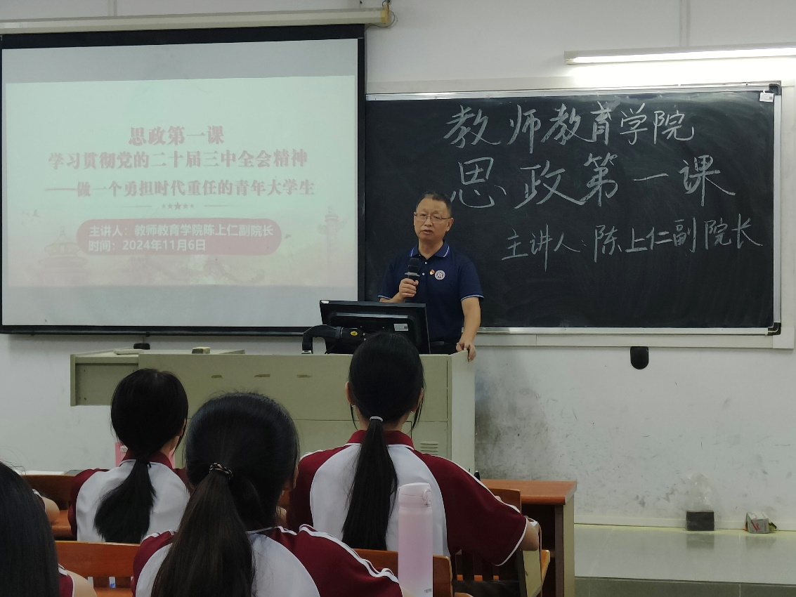 为全面贯彻党的教育方针,深入学习党的二十届三中全会精神,把握时代发展大势,教师教育学院于2024年11月6日下午在广州校区厚德楼C509和肇庆校区8号楼108开展2024年秋季学期“思政第一课”。本次课程旨在引导青年担当时代使命,以青春之力投身新时代,为中国式现代化贡献智慧与力量。本次“思政第一课”由教师教育学院陈上仁副院长、教师教育学院学生工作办公室江庆基副主任主讲。