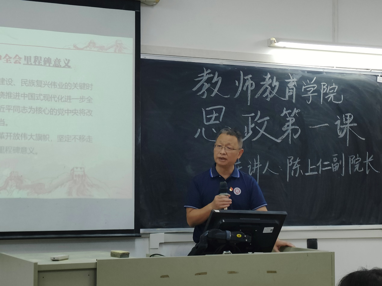 教师教育学院副院长陈上仁教授首先从“三个背景”出发,带领同学们学习党的二十届三中全会的里程碑意义,并深入学习了进一步全面深化改革的七大举措:一是聚焦构建高水平社会主义市场经济体制;二是聚焦发展全过程人民民主;三是聚焦建设社会主义文化强国;四是聚焦提高人民生活品质;五是聚焦建设美丽中国;六是聚焦建设更高水平平安中国;七是聚焦提高党的领导水平和长期执政能力。