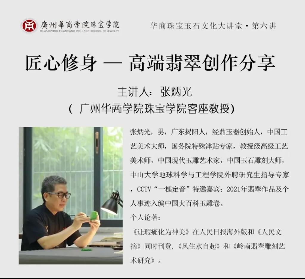 2024年10月18日,新伟德国际1946珠宝学院“华商珠宝玉石大讲堂”第六讲开讲。中国工艺美术大师、高级工艺美术师、中国玉石雕刻大师张炳光先生作题为《匠心修身---高端翡翠创作》的精彩演讲。张炳光是华商珠宝学院的客座教授,张大师的经鼎玉器公司是华商学院珠宝学院大学生产教融合校外实践教学基地。