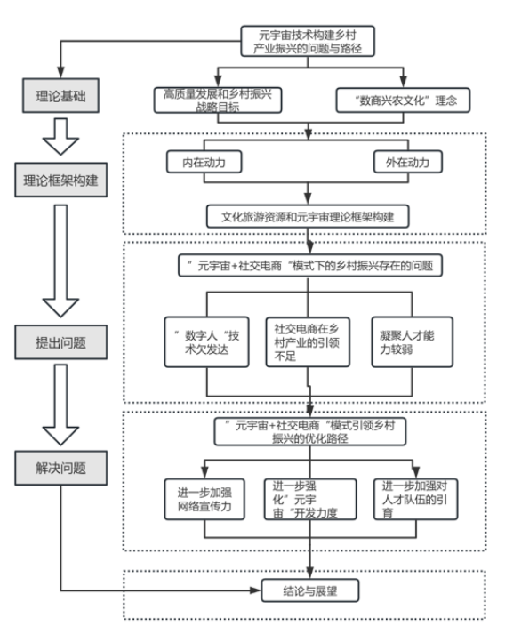 本研究旨在探讨“元宇宙+社交电商”模式如何助力中国乡村振兴战略,解决乡村特色产业发展中的问题,促进乡村经济的全面振兴和乡村高质量发展。研究团队以肇庆市上清湾村为案例,通过实地调研和政策分析,探索“元宇宙+社交电商”模式在乡村产业发展中的应用和潜力。下图为研究方法路线图。本文研究“元宇宙+社交电商”模式在乡村振兴中的应用,探讨该模式如何促进乡村高质量发展。文章创新性地提出了基于“元宇宙+社交电商”的乡村振兴方案,并将其应用于实际,致力于为乡村特色产业的成长提供全新解决方案。通过构建数字化的乡村虚拟空间,为乡村的数字化转型、品牌建设和乡村特色产业发展提供新的方向,同时为实施乡村振兴战略提出新的思路和方法。