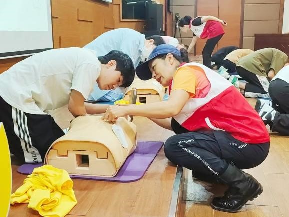 林讲师进行应急救护实操培训,用理论讲授与现场演示相结合的方式,模拟真实救援场景,向同学们普及心肺复苏、人工呼吸、胸外按压等急救知识。在实操环节,同学们踊跃参与、亲身体验,学习胸外按压、AED(自动体外除颤器)使用、人工呼吸等急救知识的施救技巧,与讲师共同演示操作流程。这种沉浸式的教学方式,不仅让同学们更加直观的认识与掌握基本的急救技能让同学们掌握了急救技能,还培养了他们的应急应变能力和团队协作精神。