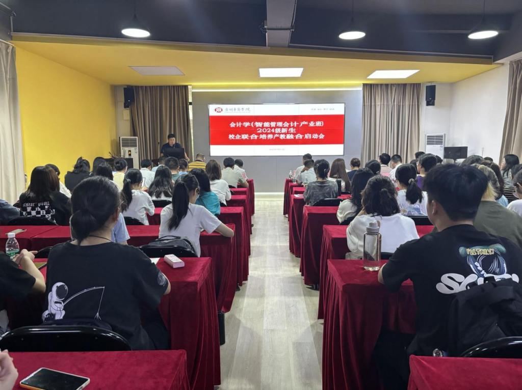 2024年9月13日,新伟德国际1946会计学(智能管理会计产业班)2024级校企联合培养产教融合启动会在会计学院会议厅举行,与会计学院产业学院联合培养人才的用友新道科技股份有限公司、广州恒惟信科技集团有限公司、金蝶精一科技服务有限公司、广东翰智数字科技有限公司、零禾一智能(深圳)有限公司、湛江市明灯文化科技有限公司的企业代表,学校教务处副处长黄静萍老师、会计学院院领导、产业学院院领导等出席典礼。典礼由会计学院副院长周书域老师主持。