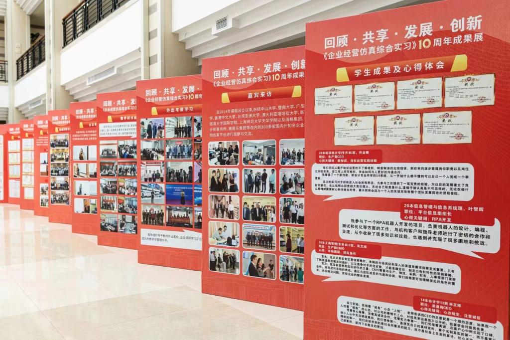 在董事长和校领导的关心和支持下,课程取得了广东省教学成果奖一等奖、广东省线下一流本科课程等一系列可喜成绩。展览的现场,一系列丰富多样的展板陈列在图书馆大厅,内容丰富,形式多样,全面回顾《企业经营仿真综合实习》10年的发展历程、教学理念和数字化教学取得的创新成果。