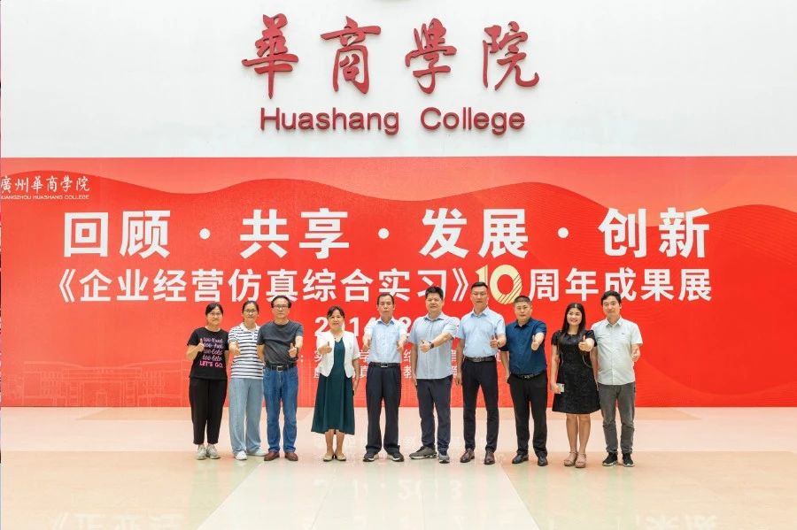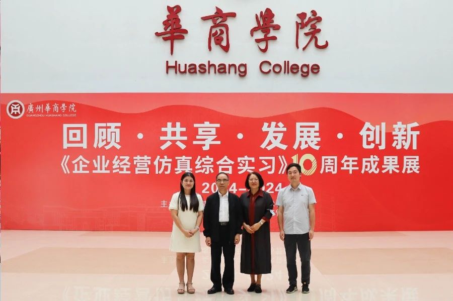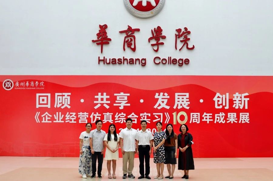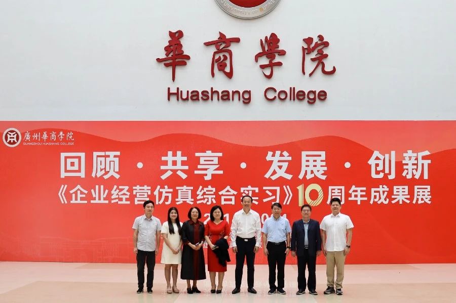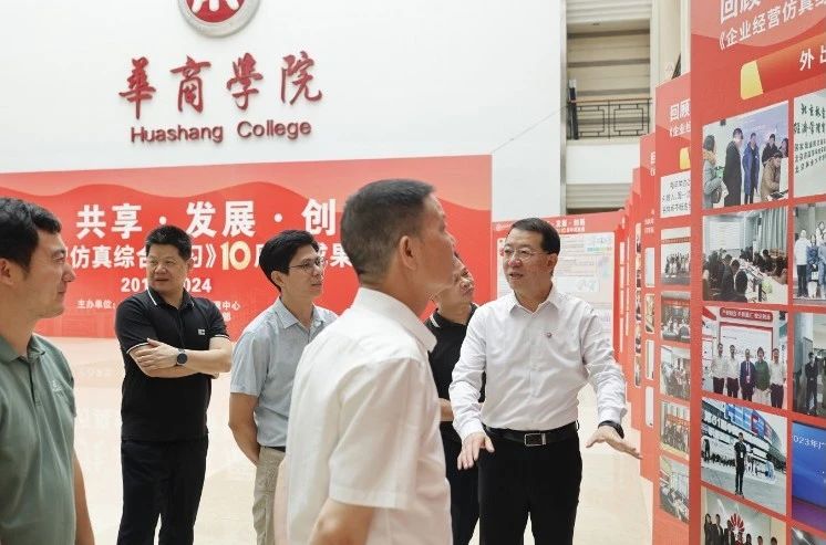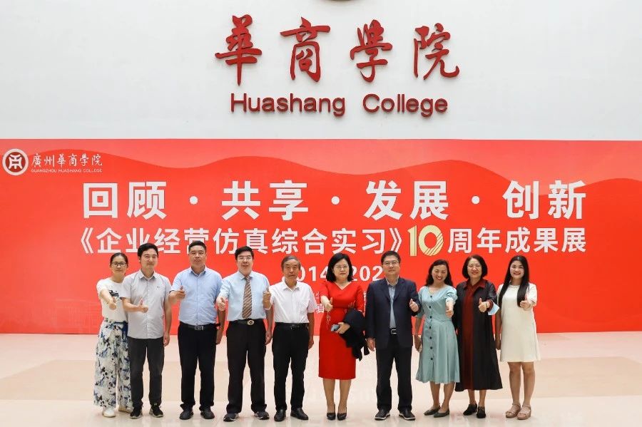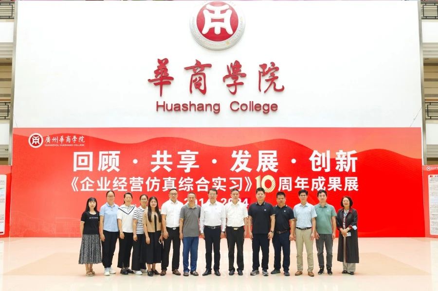 华商教育集团董事长廖榕就,学校总督学,党委书记陈玉欢,副校长刘少波、吕峻闽,学校顾问郭银华,广东财经大学国家级实验教学中心主任姚维保,副主任李立君,教学部部长陈韦伶,广东白云学院经管中心主任贺雪荣,新伟德国际1946会计学院、管理学院、人工智能学院等院系领导及师生,共同参观了《企业经营仿真综合实习》课程10周年成果展,见证了课程发展建设的阶段性“成绩单”。