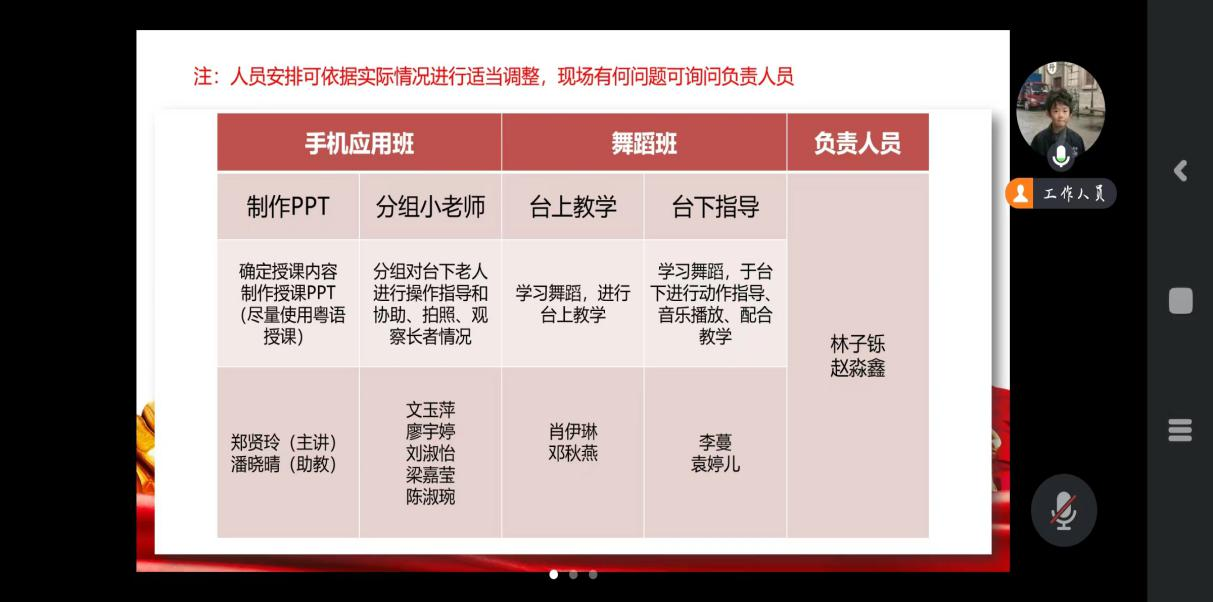 详细严谨的活动安排是保障活动顺利进行的核心要素。在活动开展前期,为保障活动顺利开展并提高志愿者的服务质量与水平,教师教育学院团委实践部工作人员于2024年3月11日在腾讯会议向志愿者们开展了乐享夕阳,“艺”缕阳光——艺术赋能文化助老志愿服务活动培训会,详细讲解了活动内容、志愿服务分工等。