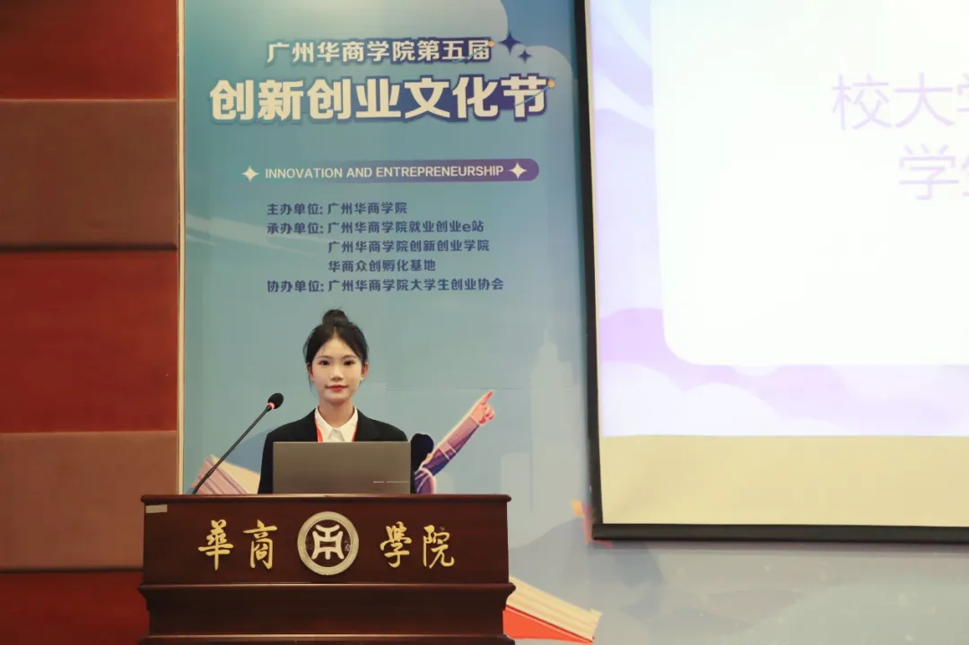 新伟德国际1946大学生创业协会学生骨干陈小冰发言,陈小冰同学总结回顾往届活动的风采,向关心支持校大学生创业协会发展的各位领导、老师、同学表示衷心的感谢,并承诺协会将继续不忘初心、开拓创新,以高质量、高标准来办好文化节系列活动,希望各位领导、老师、同学共同关注,积极参与其中。