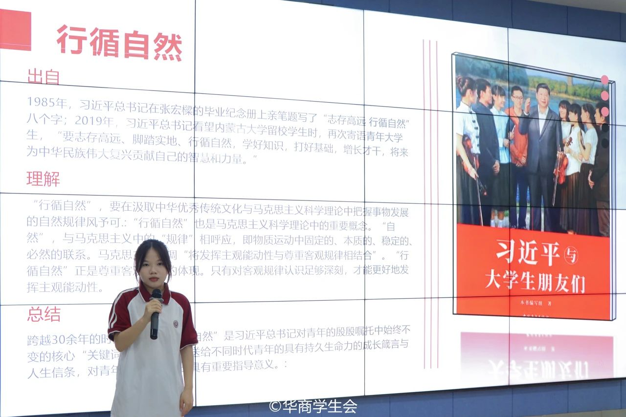 ——文学院学生会代表作分享。在2021年4月的人民日报中有这样一段话让我触动很深,“阅读是历史的回望、心灵的净化,也是梦想的启示、希望的播撒:是思想的觉醒精神的刷新,更是文明的接力、文脉的传承。”这段有深度的文字彰显着阅读的力量。借着“世界读书日”的契机,我精读了《习近平与大学生朋友们》这本书。从中可以看到习近平总书记对大学生、青年成长的深切关心、大力帮助与殷殷期待,感受到习近平总书记勤政爱民、良师益友的亲切形象。华商学子应保持特有的专业自信,认真钻研学业知识,打造丰富的精神内核,同时不负先辈之厚望,做到披荆斩棘、敢为人先。