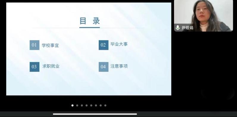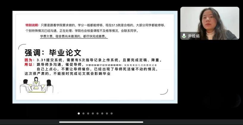 尹娅娟老师提醒同学们准备好各项毕业材料、查询学分等相关事宜。她指出,毕业论文是重中之重,在提交毕业论文期间,毕业生要多跟导师沟通交流,按时完成论文。同时,她表示,应届毕业生的毕业工作准备是关乎大学生就业的重点,面对如今复杂的就业形势,同学们要树立正确的择业观,在求职就业中要有保底思维,确保毕业时有一份保底工作,并对就业上报系统进行了演示讲解,呼吁大家积极上报就业去向。