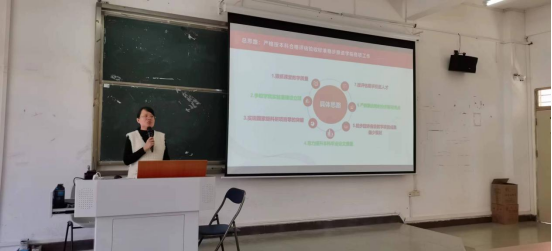 袁仕海副院长深入传达学校高质量大会会议精神,同时紧密结合学校高质量发展大会精神,为管理学院全体教职工解读并传达2024年度工作计划及工作重点。管理学院2024年工作思路与目标:以学校高质量发展大会为指引,着力推动课堂教学质量的显著提升,推动学院实验室建设立项,努力实现国家级项目的突破,提升本科毕业论文的质量,积极扭转省级教学项目成果薄弱的现状,加强产教融合和创新创业工作,同时按照评估要求引进更多优秀人才,共同推动学院的发展和壮大。袁仕海副院长指出,这一系列目标的实现将为管理学院带来显著的发展和进步,为教职工们创造更多的机遇和挑战。袁仕海副院长强调,管理学院每位教职工都是学院发展的重要支柱和推动力量,通过集体努力和合作,学院将迎来新的成就和荣耀,实现共同的发展目标,从而为教育事业做出更大的贡献。