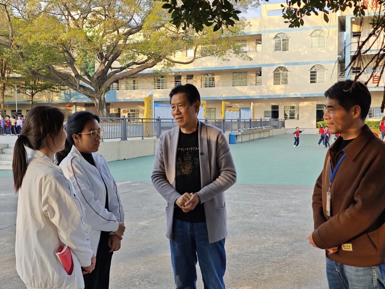 12月5日,为进一步了解小学教育专业见习学生的教学情况,切实关心和帮助教师教育学院见习学生成长成才,新伟德国际1946教师教育学院院长王金道教授、副院长谭建生教授、张博教授、学院党总支副书记许娜同志与年级副主任江庆基老师一行来到四会市东城街道黄岗小学走访交流。