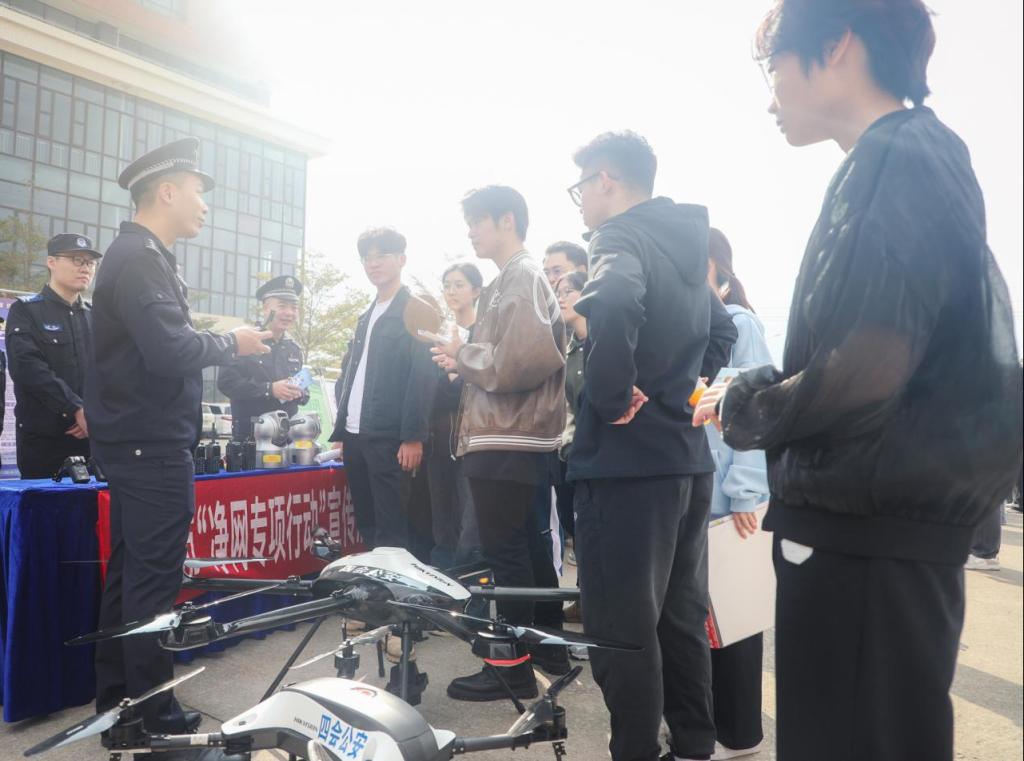 活动现场设有交通安全、警用装备、禁毒宣传、反诈宣传、网络安全以及业务咨询等多个展区,让师生深入了解平安建设的方方面面。