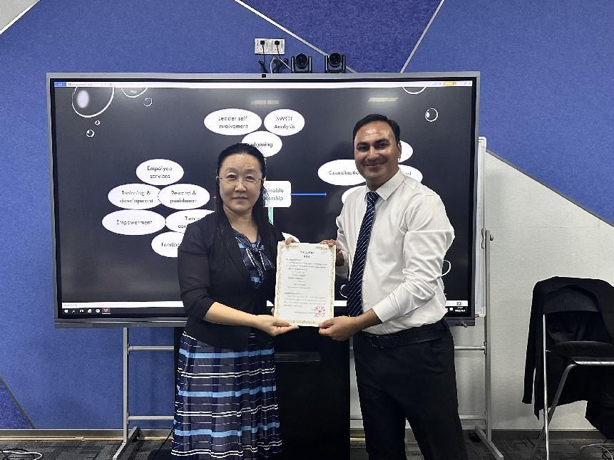 回雁雁院长结合自身在国外研修MBA的学习内容以及本次讲座带来的新的思维角度,强调了终身学习和关注前沿科研成果,不断丰富个人知识结构的重要性。回雁雁院长还向Arshad Muhammad博士颁发了讲座证书。
