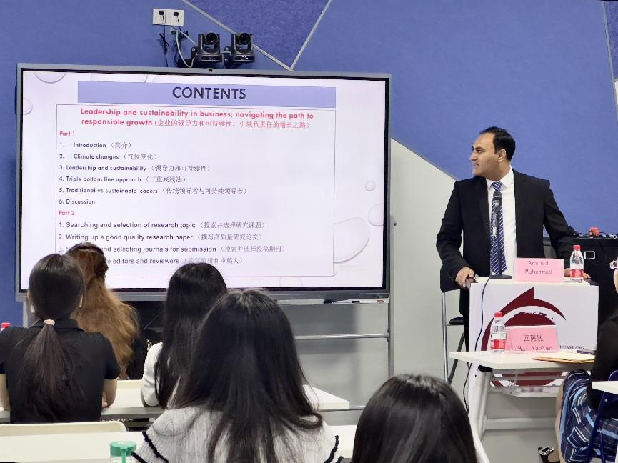 为拓宽大学生的国际视野,了解管理学和领导科学的最新研究成果,2023年11月8日,国际学院在启智楼401举行主题为“Leadership and sustainability in business:navigating the path to responsible growth”(企业的领导力和可持续性:引领负责任的增长之路)的文化素质讲座。巴基斯坦籍Arshad Muhammad博士担任主讲嘉宾,新伟德国际1946国际学院院长回雁雁、巴基斯坦籍教师Aneela Qadir博士、国际学院ACCA专员姚晓敏以及来自国际学院、健康医学院、管理学院、伟的国际1946bv官网、文学院、数据与科学学院的30多名大学生现场聆听了讲座。