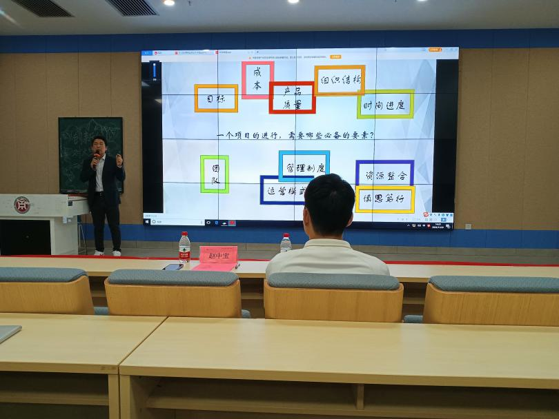 赵中宝老师向同学们介绍了各类创新创业大赛,鼓励同学们要积极参加不同类别的创新创业活动。在参加活动中,寻找准确性,找到自己喜欢做的事情,确定它对你的意义,然后不遗余力地去做好。他介绍,一个项目活动的进行,团队、管理制度、运营模式、资源整合以及慎思笃行是必备的要素。其次目标、成本、产品质量、组织结构以及时间进度是一个项目进行中的重中之重。