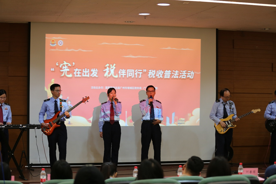 活动伊始,增城区税务局“远方田野”乐队现场奏唱歌曲《听见中国听见你》《乡恋》,并与现场师生齐唱《宪法伴我们成长》,助推法律文化“声入人心”。