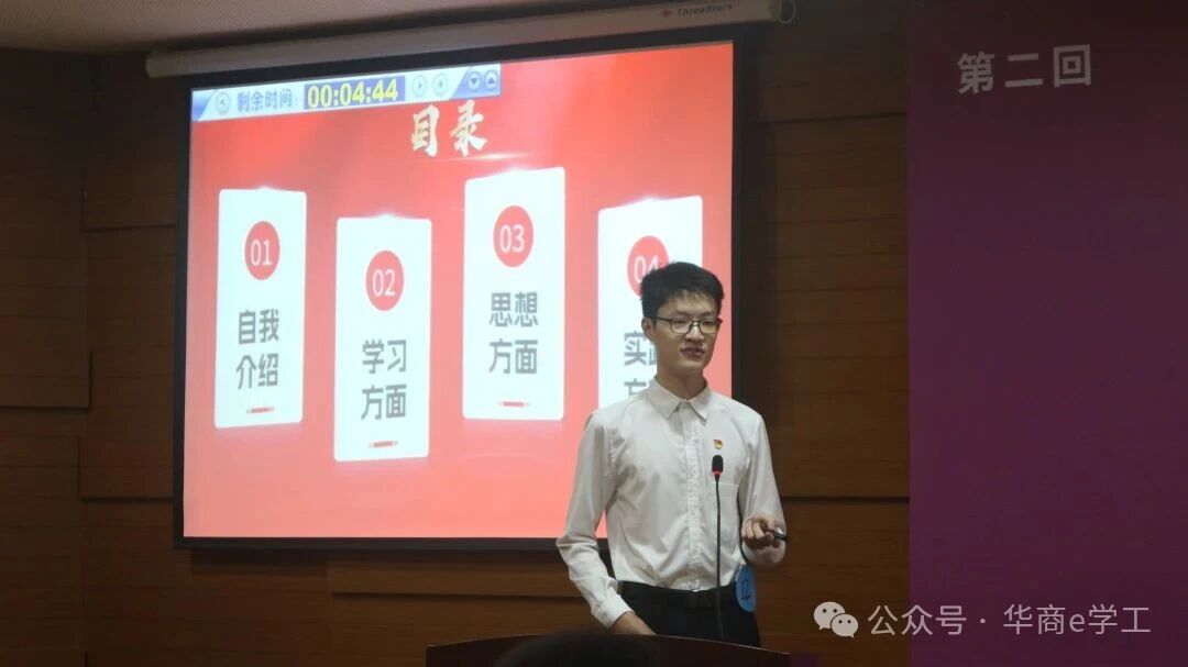 随后,竞选环节拉开帷幕。候选人依次登台,借助精心准备的演示材料,在演讲与答辩中,生动展现了他们在学业科研、社会实践、志愿服务等领域的优异成绩与全面发展的个人风采。他们或慷慨激昂,或沉着冷静,用真挚的语言讲述了在校期间的成长与收获。在面对评委们的提问时,候选人们思维敏捷、对答如流,充分展现了华商学子过硬的专业能力、清晰的逻辑思维和良好的精神风貌。