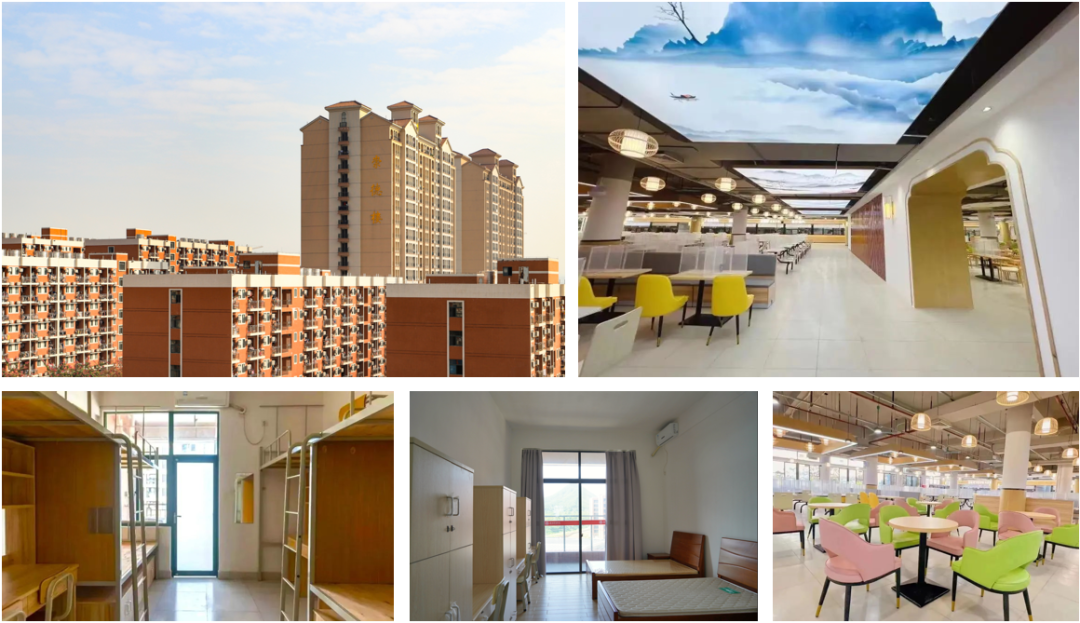 学校学生宿舍类型设有三人间、四人间及六人间,所有的宿舍都配备空调、饮水机、洗衣机、独立卫浴以及阳台。