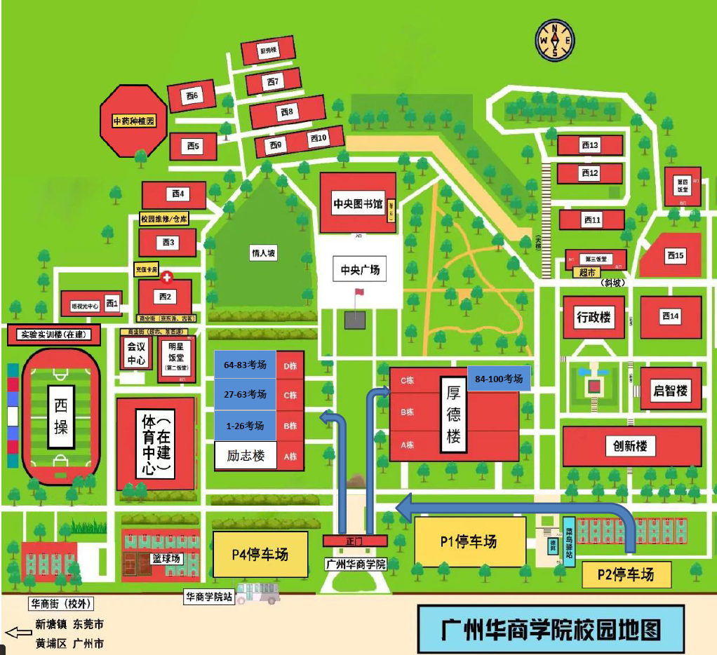 考生应预留充足的时间,提前做好来校乘车路线规划和时间安排,广州市内可通过搭乘地铁(21号线-增城广场站A出口)和公交车(增城9路/增城14路/增城64路/增城65路)等交通工具换乘后,在华商学院站下车。