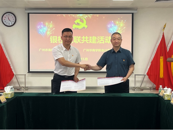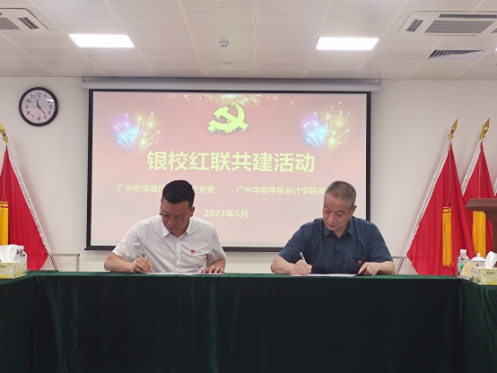 2023年5月26日,会计学院党委和广州农商银行增城支行(简称“农商行增城支行”)党委在合汇广场增城农商行总部进行红联共建主题活动及签约仪式。本次活动是根据学习贯彻习近平新时代中国特色社会主义思想主题教育的要求,结合共建双方实际,实现资源共享、优势互补、互助共建,促进党建与业务发展“同频共振”,开展“校银携手,合作共赢”为主题的红联共建工作。广州农商银行增城支行党委副书记兼纪委书记赵明、党委委员兼行长助理谢超颖、党委委员兼零售业务部经理田春雷,新伟德国际1946会计学院党委副书记陈洋广、党委委员兼副院长周书域、学工办副主任兼党支部书记杨烨瀚等一行出席活动。农商行增城支行部门经理、员工党员代表,会计学院部分党支部书记、20名学生党员代表共同参加本次活动。