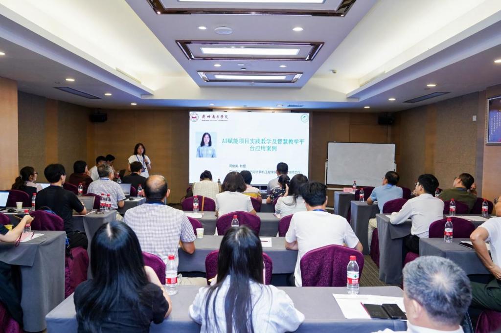 广州南方学院电气与计算机工程学院副院长苑俊英教授展示“教学一体机”革命性应用。她表示,在设备上完成“AI模型训练边缘部署性能优化”全流程,学生人均实操时间从每周2小时增至10小时。