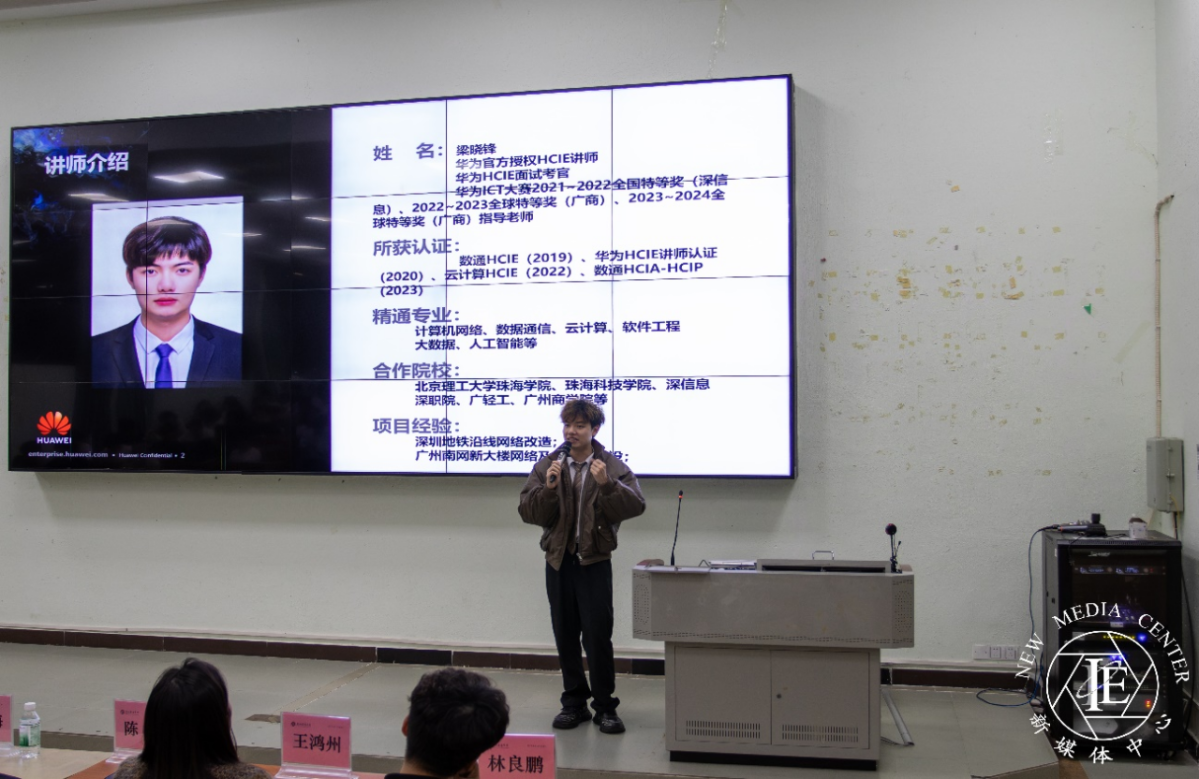 随后,华为授权HCIE专家梁晓峰先生讲话,强调了选择人工智能、大数据等专业的明智性,并对当前教育环境下的就业形势进行了深入分析。他指出,在当今快速发展的科技时代,仅拥有大学文凭已不足以保证职业生涯的成功,而需要更加注重实践技能的培养。