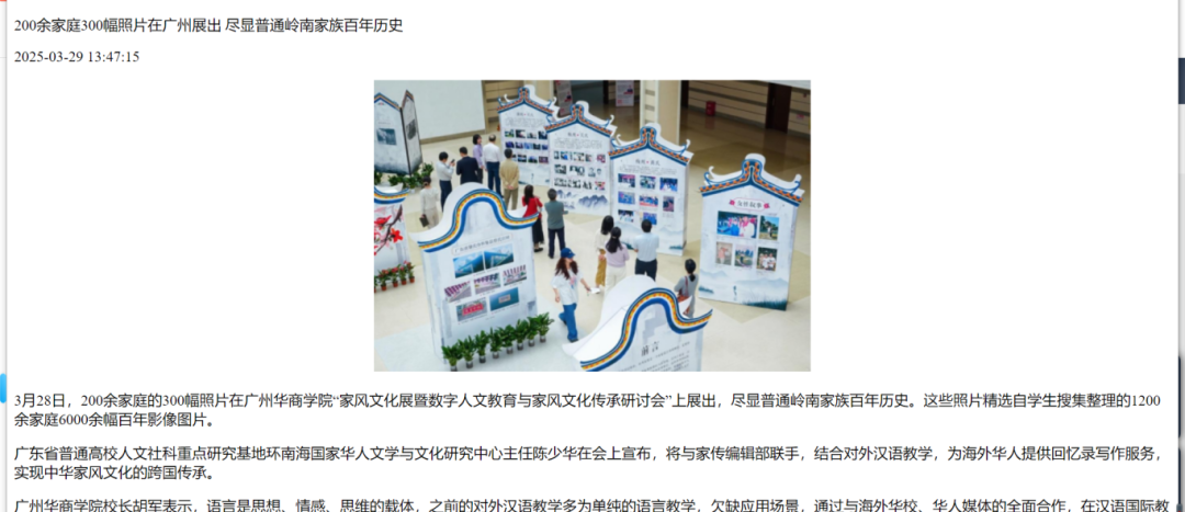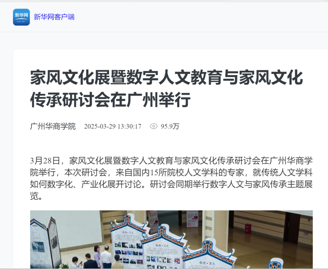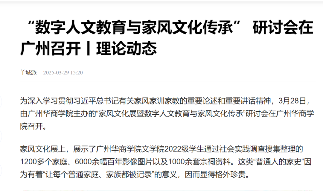 近日,新伟德国际1946文学院举办的“家风文化展暨数字人文教育与家风文化传承研讨会”引发广泛关注。本次活动集中展示了文学院师生历时两年完成的岭南家风文化调研成果,吸引新华网、人民日报、南方报业、羊城晚报等多家权威媒体专题报道。