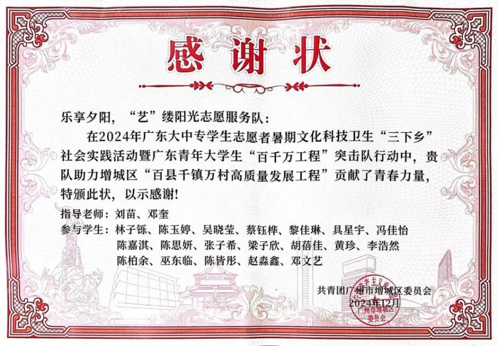近日,新伟德国际1946教师教育学院组建的“星火接力,情系‘九益’”“点亮‘小楼’,暖心筑梦”“乐享夕阳,‘艺’缕阳光”三支社会实践队伍,因在增城区“百县千镇万村高质量发展工程”中表现突出,荣获共青团广州市增城区委员会颁发的感谢状。这是对教师教育学院学子践行社会责任、服务基层发展的充分肯定,彰显了华商学子在乡村振兴中的青春担当。