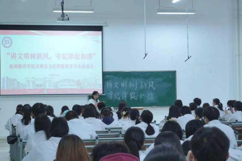 会议伊始,教师教育学院团委副书记杜范老师强调了文明、安全、纪律对校园生活的重要性,并指出学生干部应发挥模范带头作用,以身作则,引领同学们共同进步。她承诺学院将全力支持文明安全纪律教育月活动,为学生提供必要的指导和帮助。杜范老师希望同学们积极参与活动,共同营造文明、安全、和谐的校园环境,为学校“创百年名校,育华夏英才”的目标贡献力量。