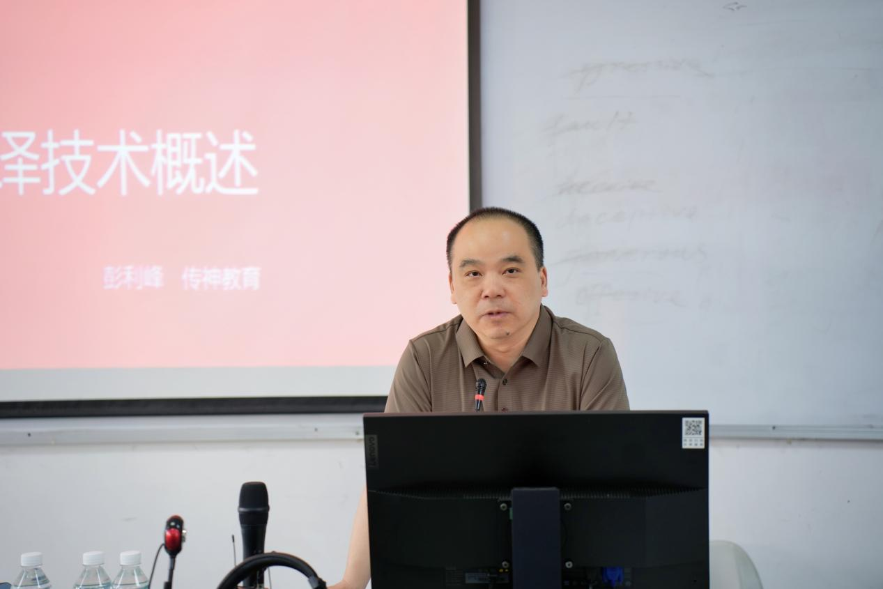 启动仪式结束后,由彭利峰老师进行授课。彭利峰老师首先向同学们介绍了翻译技术发展现状和趋势,开展了CAT工具实践应用——以云译客为代表的在线云端协同翻译操作。在智能翻译项目管理实战演练环节,彭利峰老师从规划与术语管理、机器翻译引擎筛选与测试、翻译与AI工具应用、审校与质量把控、译文导出与排版五个方面展开。学生认真听讲,积极配合老师,记下讲课重点,并体验翻译工具,尝试进行“人机共译”。