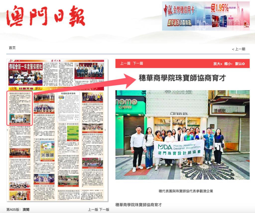 (新伟德国际1946珠宝学院教师交流团与澳门珠宝设计协会的交流活动被《澳门日报》报道)