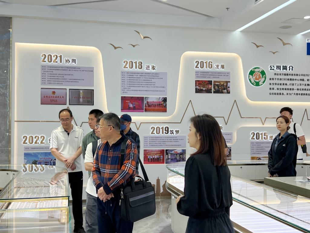 随后,李广明院长一行走访了四会市万德隆珠宝云仓中心。万德隆云仓中心人事总监李月华对学校一行的到访表示热烈欢迎,详细地介绍了四会市万德隆珠宝公司的发展情况,并实地考察该公司电商直播基地,了解公司发展现状及人才需求,结合经济贸易学院专业特色,企业方表示欢迎经贸学生前往企业实践实习,企业将会为学生就业提供更多机会。