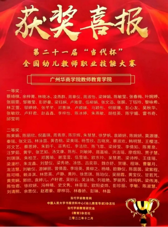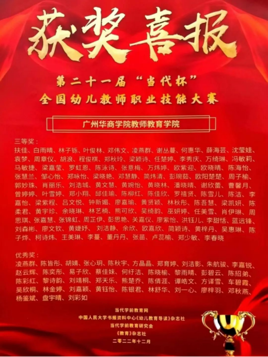 教师教育学院多名学生在2022年第二十一届“当代杯”全国幼儿教师职业技能大赛中发挥他们最佳的实力,展示华商学子的良好风貌,取得优异的成绩:一等奖40位,二等奖105位,三等奖104位,优秀奖40位。