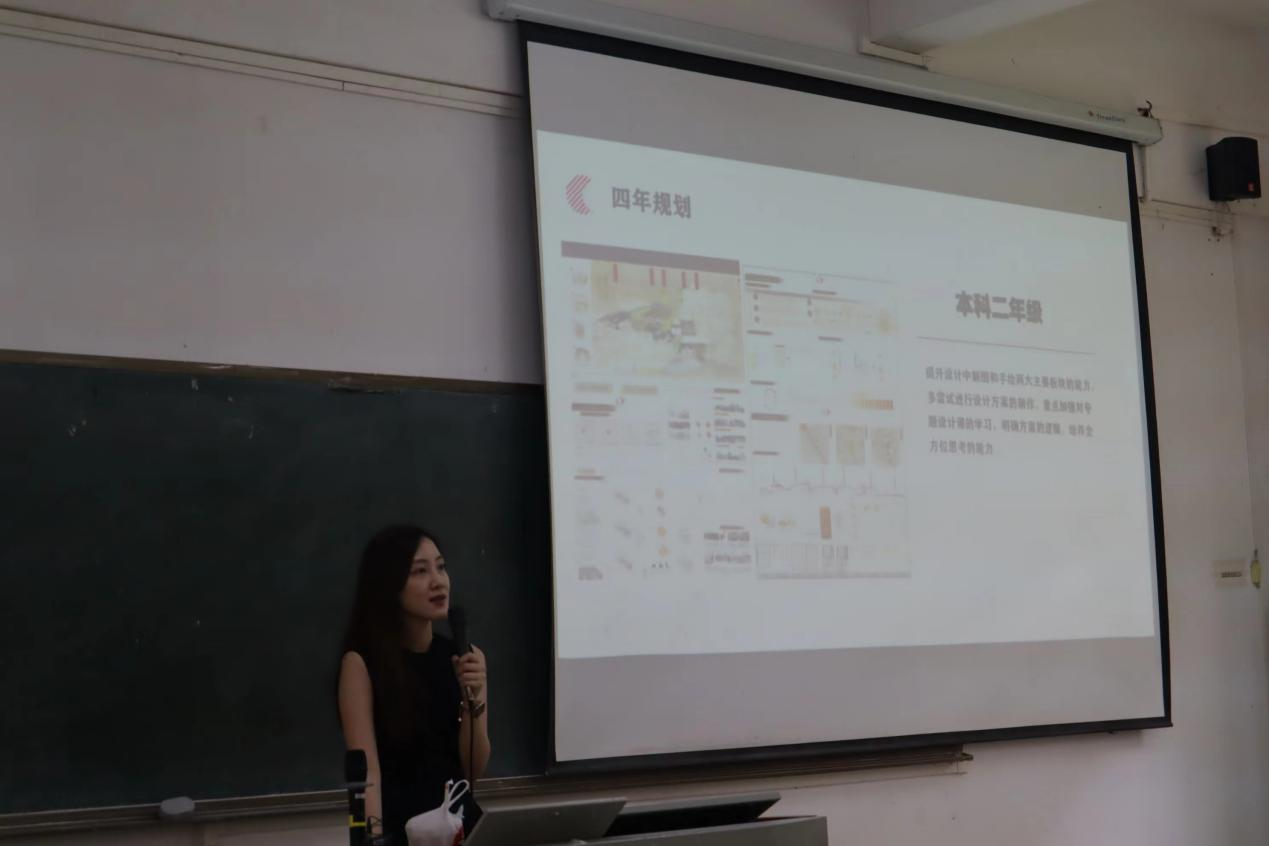 黄曦葶校友向同学们介绍应该如何规划大学四年的学习生活,劝诫学弟学妹们要把握大学的时光,努力学习专业课知识,保持对设计的热情,树立好自己的奋斗目标,根据自身兴趣有序规划未来。她结合自己的学习经历和工作经验,为同学们分享了宝贵经验和中肯的建议,使聆听讲座的同学们深受启发,充分调动了同学们学习积极性的同时,也缓解了大家面临的迷茫和彷徨。希望同学们也能够以优秀校友为榜样,明确学习目标,确立奋斗方向,砥砺奋斗前行,书写人生华章!