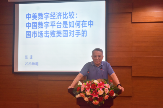 张捷教授从中美电子商务和互联网服务比较、中国数字经济高速发展的原因、中美数字平台对中国市场的争夺、总结和讨论四个方面进行了阐述。