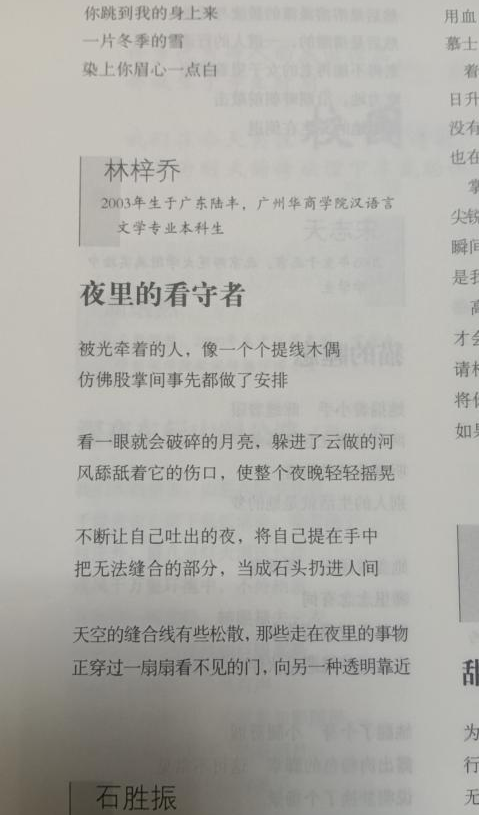 林梓乔坦言,自己是从高中开始尝试进行诗歌创作,在大学期间开始有意识地进行训练。他说:“正式进行诗歌创作,是在大一下学期初。那时在张倩老师的大学写作课上,我学习了很多关于诗歌的语言表达技巧,并且刻意去阅读一些诗人的作品,为完成诗歌期末作业,反复训练和打磨自己的语言。2022年4月第一次匿名参加了荔核诗社的匿名诗会,票数挤进了前三,得到肯定,内心无比激动。”