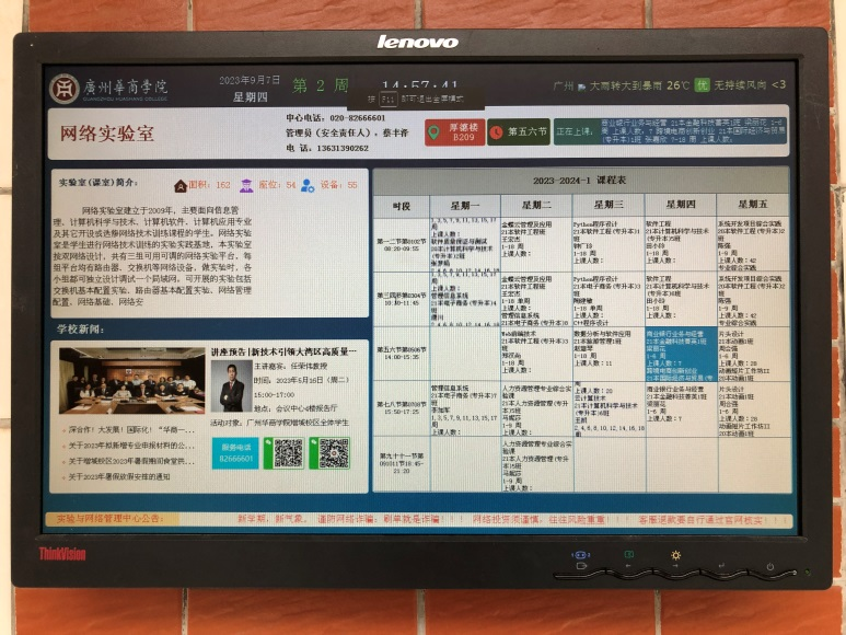 在实验室信息化建设方面,学校实验管理中心通过利用改造后报废的旧设备,自主研发了实验信息管理系统,逐步替代原有的门牌。试运行的电子班牌,效果良好,可操作性强,兼具了电子班牌、校园新闻播报、校园安全宣传、考试信息提示等多功能,实现了实验室门牌信息化与智能化。