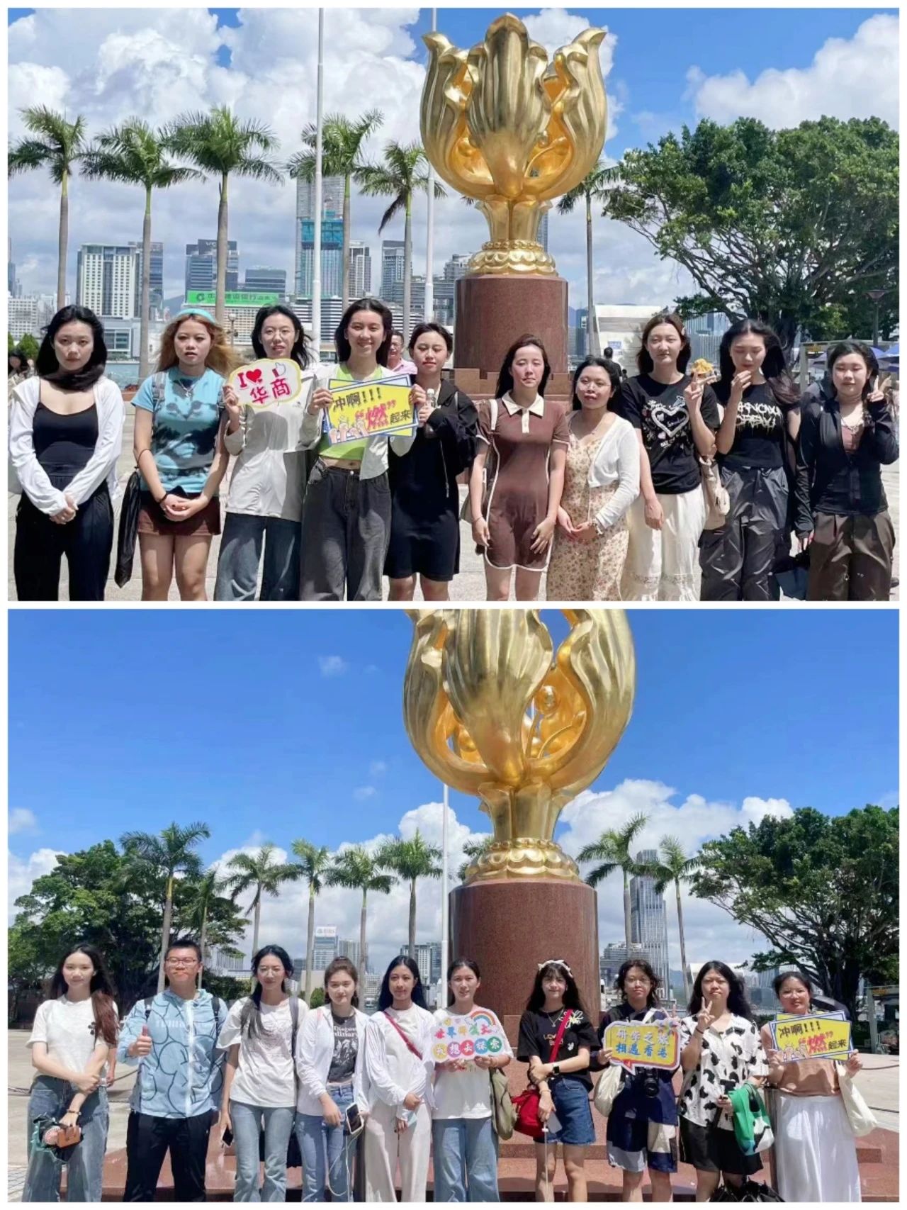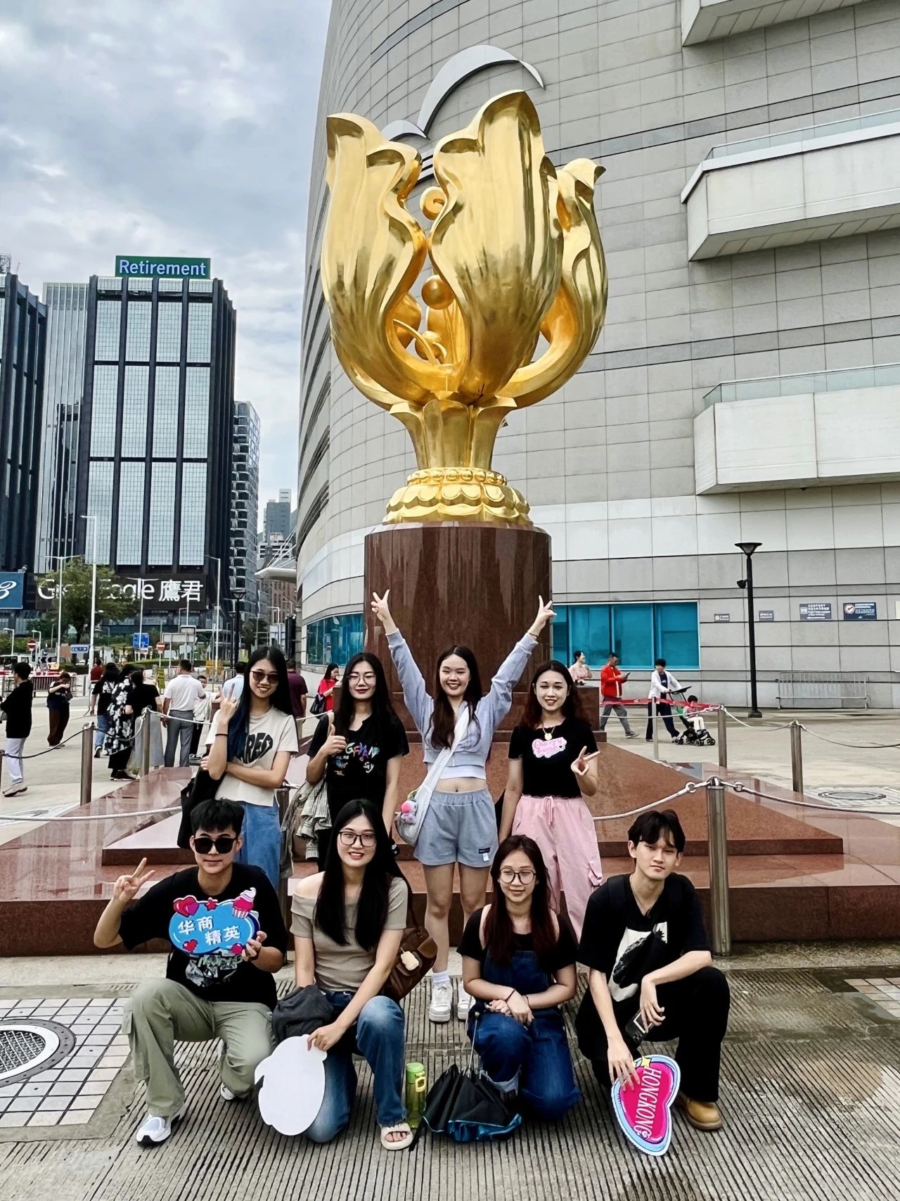 同学们在金紫荆广场集合并合影留念,他们选择自己喜欢的手势或动作热身,开始他们丰富多彩的互动活动,探索美丽香港,在研学之旅中收获不一样的知识。