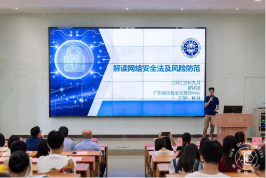 近几年,我国网络安全形势发生了非常大的变化,我国是名副其实的网络大国,网民人数全球第一,网络创新活跃,越来越多的业务都在互联网化,网络已融入经济社会生活的各个方面。但同时,我国也是网络安全事件的重灾区,网络攻击活动日渐频繁,个人信息泄露事件频发。因此《网络安全法》的出台,对于我们每个网络服务的提供者、网民都有非常积极的帮助。广东省信息安全测评中心研究员曾祥斌为全体师生解读网络安全法及风险防范,具体通过网络安全法出台的背景、网络安全法的主要内容、网络安全法禁止的八类活动和七种行为、网络安全法第一次修改内容以及主要违法风险等几个方面为大家进行解读。他提醒广大师生自觉遵守国家关于互联网管理的相关法律法规,增强政治敏锐性和政治鉴别力,正确认识、了解网络,以积极心态面对网络,让网络成为大学生成长学习的良师益友,最后他对有志于从事网络安全职业的同学们建议:一是要紧跟形势,学法懂法;二是要锻造技术,提升能力。