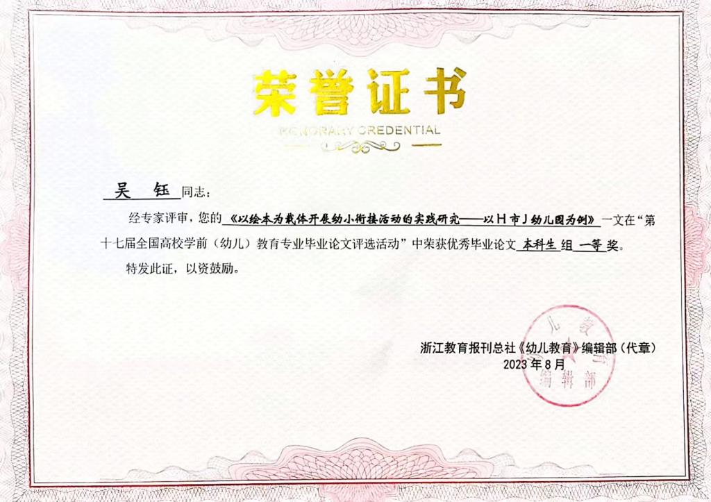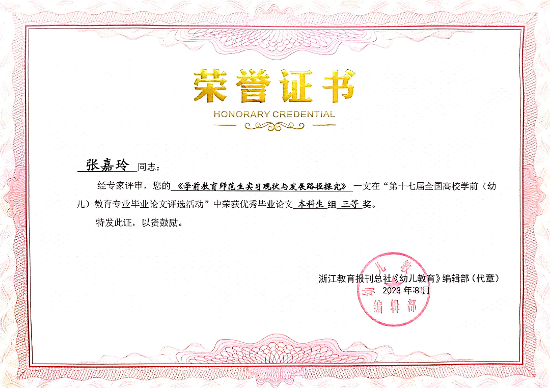近日,由浙江省教育报刊总社《幼儿教育》编辑部主办的第十七届全国高校学前(幼儿)教育专业优秀毕业论文评选活动结果揭晓。新伟德国际1946教师教育学院学前教育专业选送的论文分别荣获本科生组一、二、三等奖。