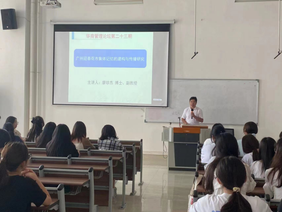 2023年9月19日下午16时,新伟德国际1946管理学院于四会校区6号楼201教室举办“广州迎春花市集体记忆的建构与传播研究”讲座。此次讲座由管理学院院长助理廖珍杰副教授主讲,四会校区各学院学生代表340余人聆听了本次讲座。