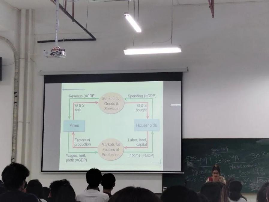 Aneela博士采用了大量详细的统计数据示例,从消费、投资、政府购买和净出口四个部分分析了GDP的构成。在讲座中还运用循环流程图,基于GDP的多个概念,深刻分析了GDP对公司、家庭、政府、金融体系、外国部门的影响,让同学们对内容的理解更加简单。