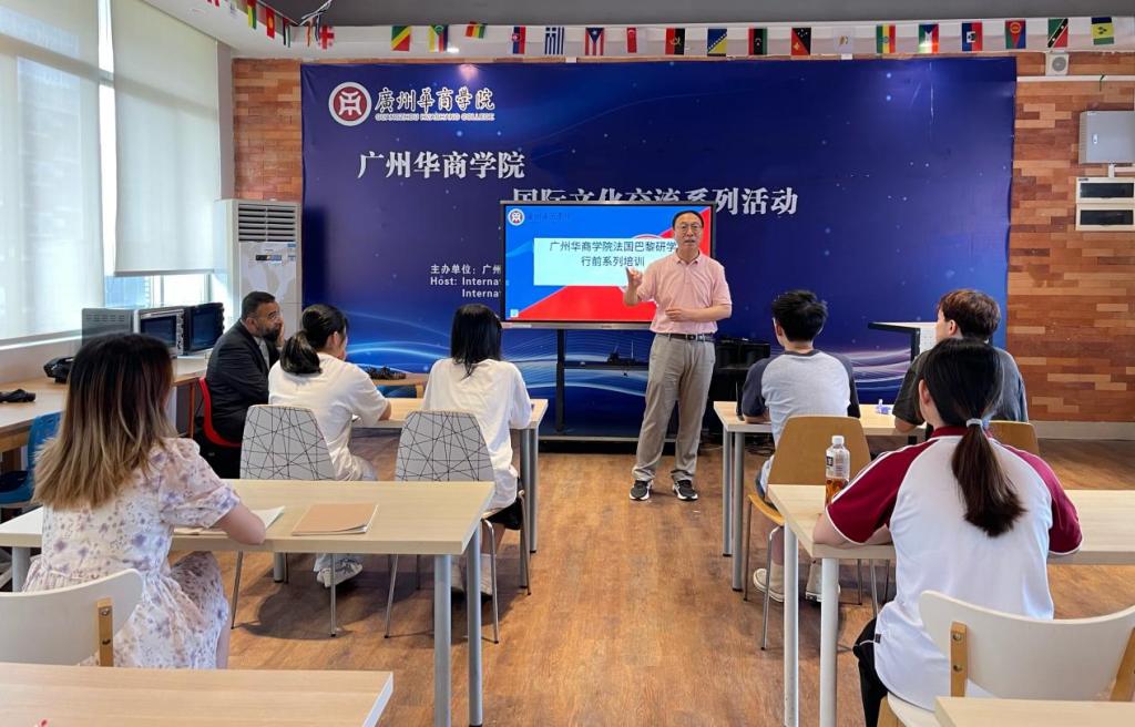 5月7日,我校在广州校区举办了优秀学生赴法国巴黎研学行前培训系列课程开班仪式。国际交流与合作处处长王文忠、伟的国际1946bv官网外教Tahir Shaikh、法语教师齐爱萍、国际交流与合作处吴文诗老师参加本次培训活动。