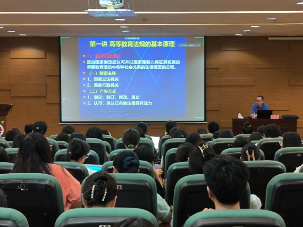 郭凯教授本次培训课程内容从高等教育角度出发,将有关高等教育的多个延伸方面的概念和内容传授给新教师。在第一讲《高等教育法规的基本原理》里,郭凯教授对高等教育法规概括进行讲解,包含教育法的含义、渊源和效力,以及教育法治的价值和进展;第二讲《高等学校的法律地位》是对高等学校的法律地位进行阐述,其中《教育法》和《学位条例》等教育法律法规都属于行政法规;第三讲《高校教师的权利与义务的法律分析》则是讲解到高校教师的权利与义务,教师资格制度的含义与意义,让新教师们深刻明白自己的本职。