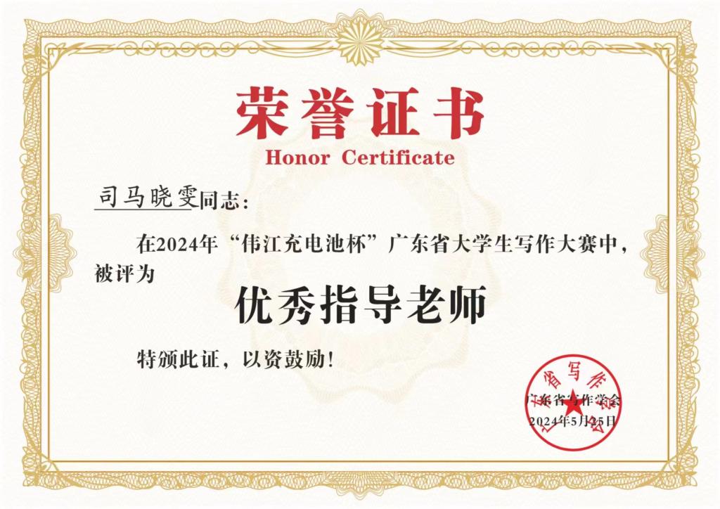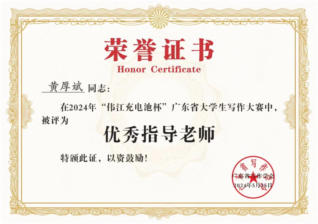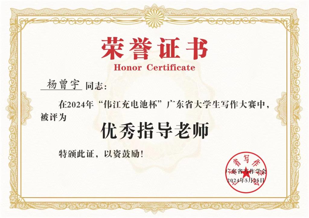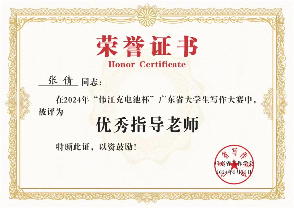 学子们取得佳绩,离不开老师的谆谆教诲,感谢在此次广东省大学生写作大赛中为学子提供指导的各位老师,助力我校热爱文学创作学子踏上自己的文学之旅。恭喜我校五位教师在本次大赛中获得“优秀指导老师”称号。