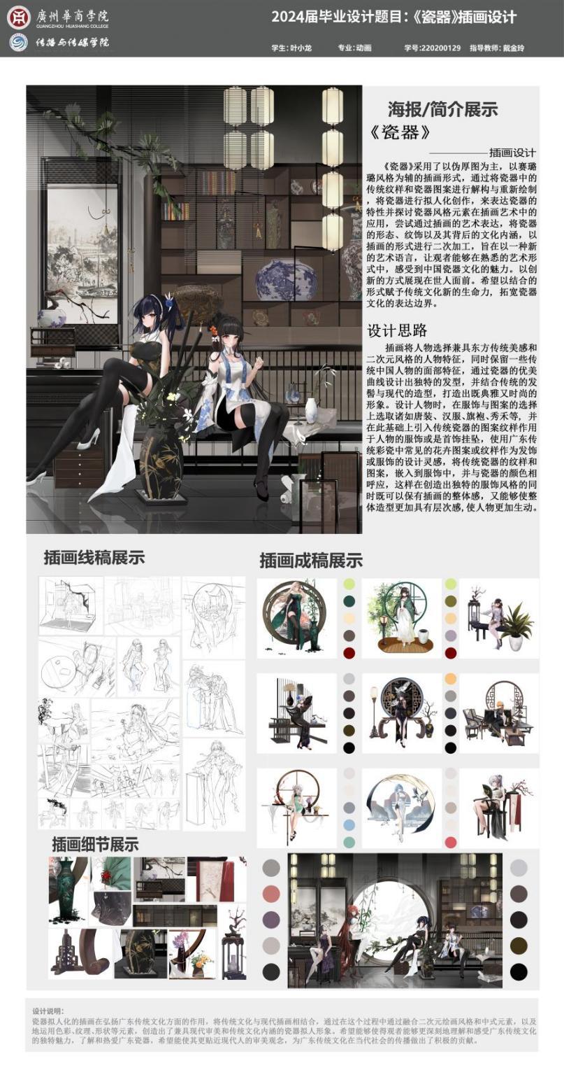 设计阐述:瓷器拟人化的插画在弘扬广东传统文化方面的作用,将传统文化与现代插画相结合,通过在这个过程中通过融合二次元绘画风格和中式元素,以及地运用色彩、纹理、形状等元素,创造出了兼县现代审美和传统文化内涵的瓷器拟人形象。希望能够使得观者能够更深刻地理解和感受广东传统文化的独特魅力,了解和热爱广东瓷器,希望能使其更贴近现代人的审美观念,为广东传统文化在当代社会的传播做出积极的贡献。