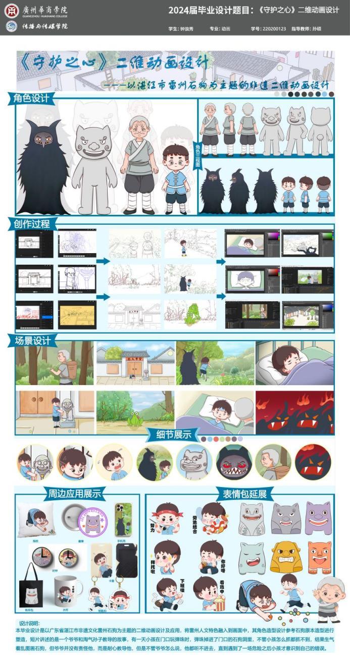 设计阐述:本毕业设计是以广东省湛江市非遗文化雷州石狗为主题的二维动画设计及应用,将雷州人文特色融入到画面中,其角色造型设计参考石狗原本造型进行塑造,短片讲述的是一个爷爷教导淘气孙子的故事,有一天小孩在门口玩弹珠时,弹珠掉进了门口的石狗洞里,无论小孩怎么抓都拿不到,结果生气地在石狗上乱图画,但爷爷并没有责怪他,而是耐心教导他,但是不管爷爷怎么说,他都听不进去,直到遇到了一场危险之后小孩才意识到自己的错误。