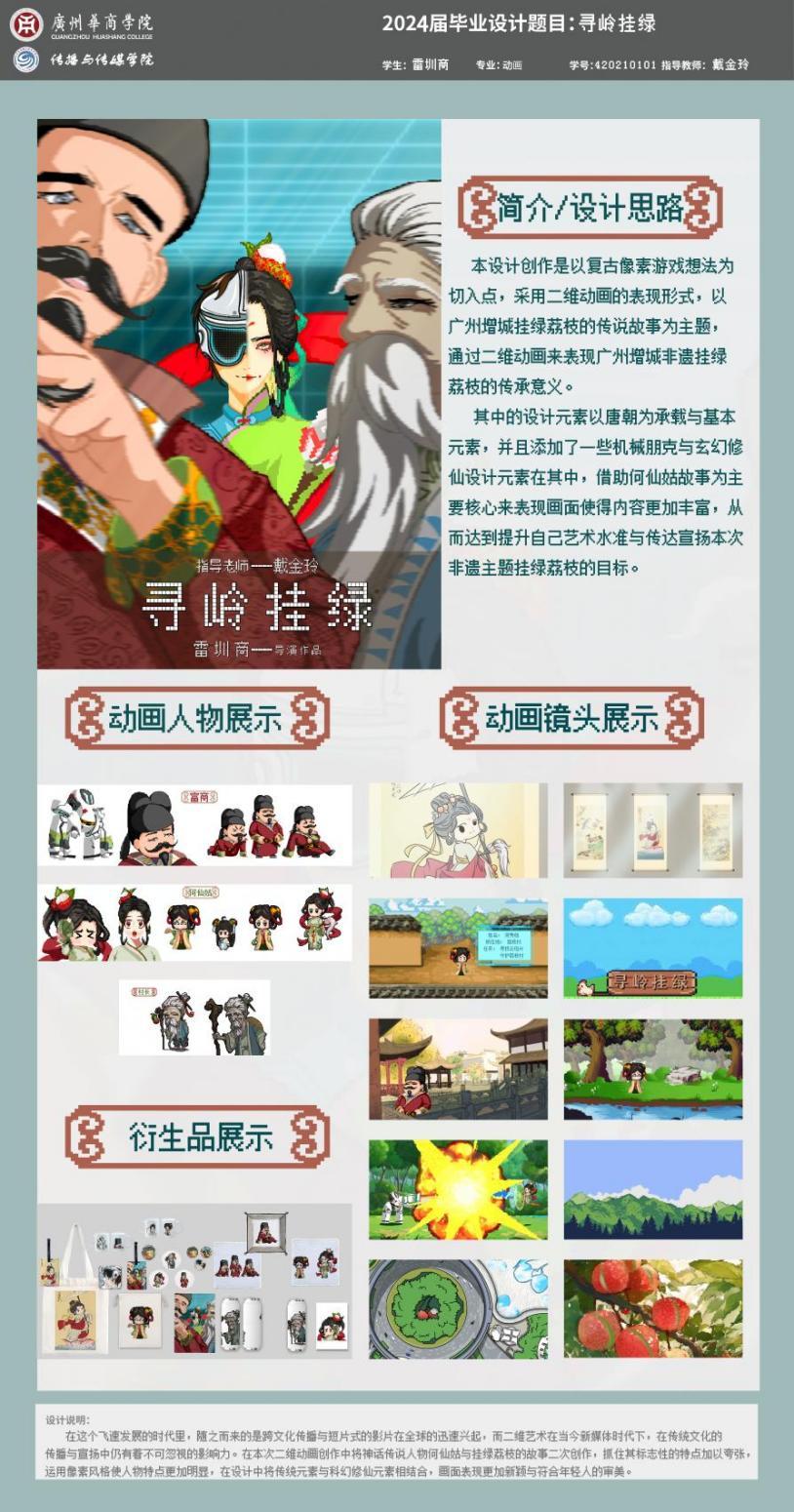 设计阐述:在这个飞速发展的时代里,随之而来的是跨文化传播与短片式的影片在全球的迅速兴起,而二维艺术在当今新媒体时代下,在传统文化的传播与宣扬中仍有着不可忽视的影响力。在本次二维动画创作中将神话传说人物何仙姑与挂绿荔枝的故事二次创作,抓住其标志性的特点加以夸张,运用像素风格使人物特点更加明显,在设计中将传统元素与科幻修仙元素相结合,画面表现更加新颖与符合年轻人的审美。