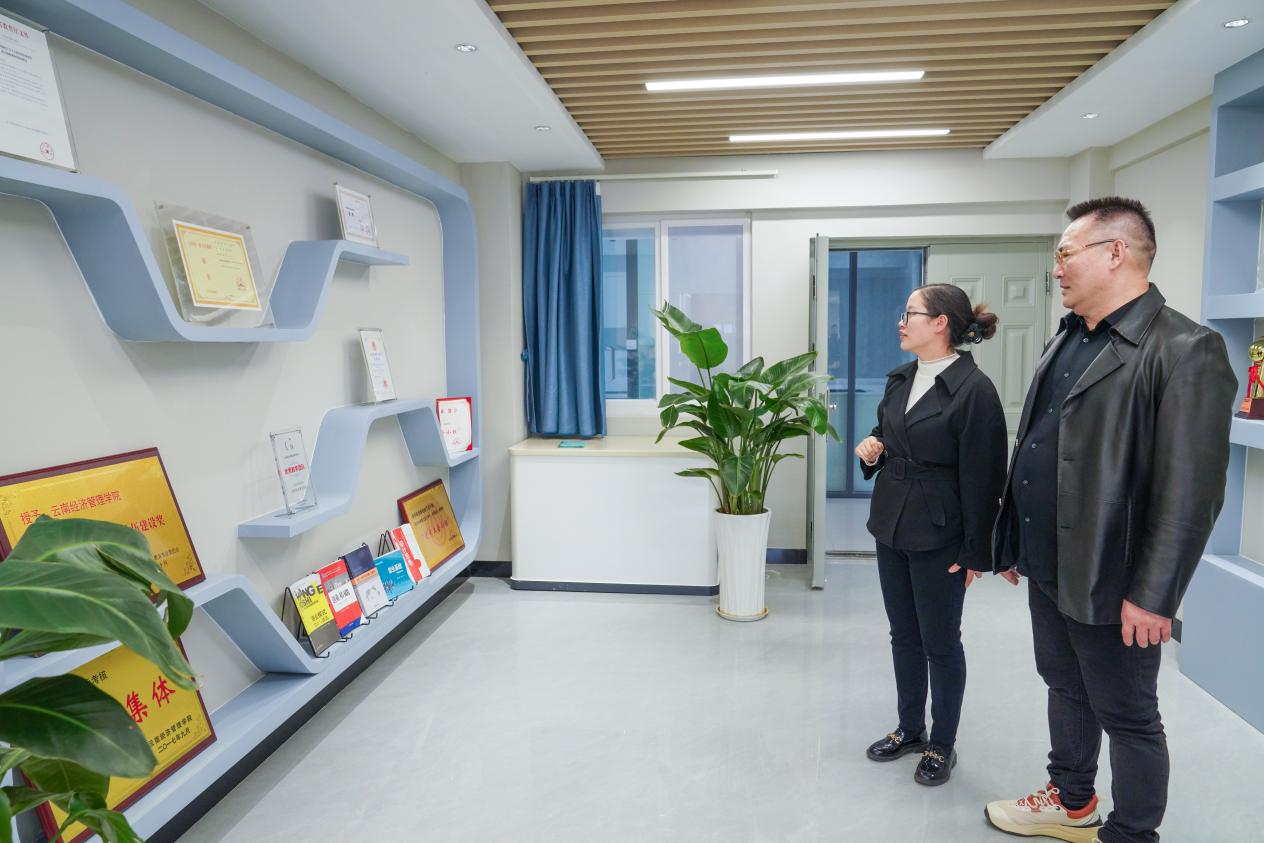 第三站,曾龙威处长一行赴云南经济管理学院,与云南经济管理学院创新创业学院教学副院长刘文凤、创新创业学院教研室主任金灵等进行交流座谈,并参观了云南经济管理学院的大学生创新创业成果展。该展厅充分展示了云南经济管理学院在创新创业教育方面的积极探索和显著成效。